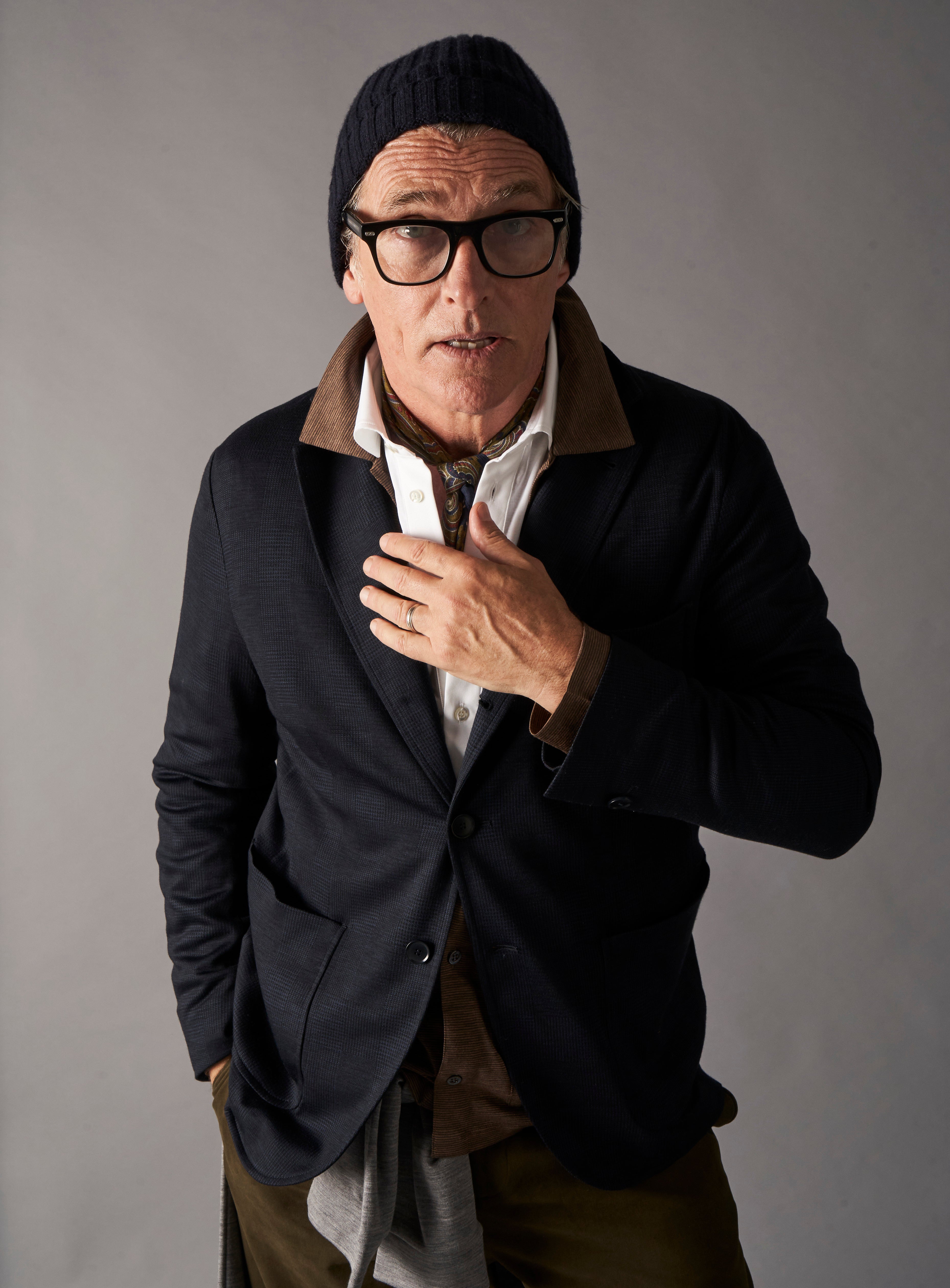 Man wearing a dark jacket, white shirt, green pants, and glasses against a gray background